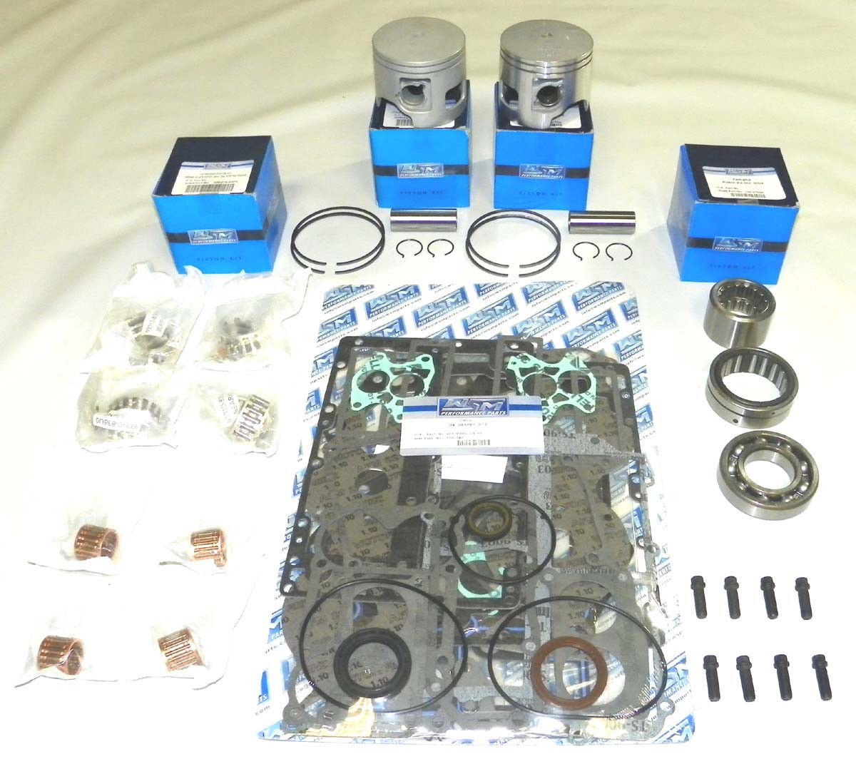 Brand New High Quality WSM 4 Pistons, rings, pins and clips, complete gasket kit, crank bearings, rod bearings and rod bolts